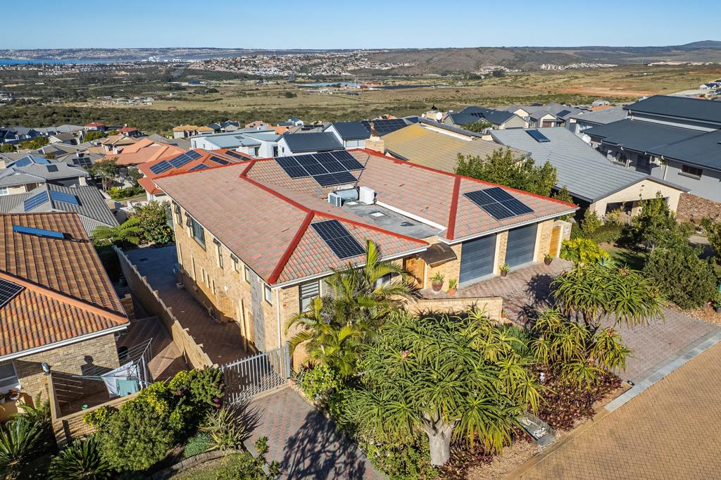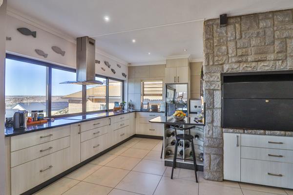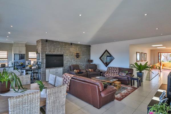 The open plan living area opens out onto a balcony with sea and country views. The indoor braai makes for great family entertaining. There is also an outdoor braai on the lower level. The main bedroom with en suite full bathroom opens onto a spacious indoor sunroom with sea views. The bedroom has a luxurious walk in closet.