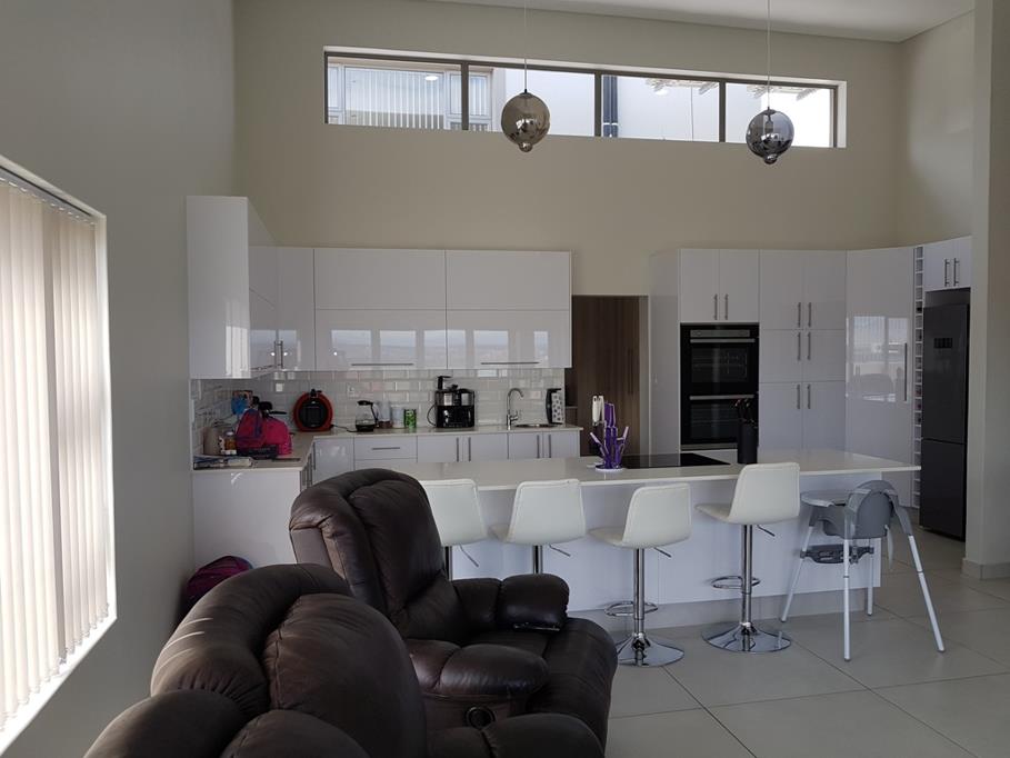 The open plan living area opens out through stack doors onto a covered patio and garden with sea and country views as well as a pool. The stainless steel indoor braai and bar makes for great family entertaining.