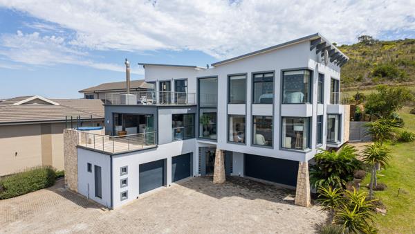 The first floor is surrounded by glass which makes the most of the spectacular panoramic sea views by day and the lights of Mossel Bay at night. A formal lounge boasts a gorgeous fireplace and a spacious bedroom with en-suite