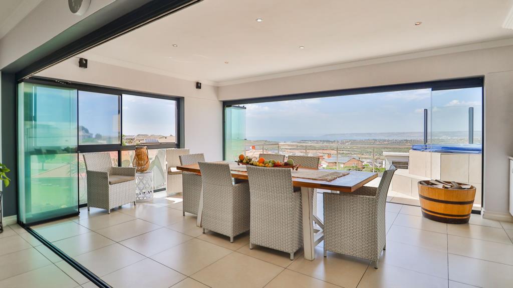 facilities, together with a comfortable study. The ultra modern dream kitchen with a large breakfast island is complimented by a large dining room with built in braai all opening up through frameless glass panels onto a spectacular patio with a Jacuzzi for ultimate relaxation and views to put it over the top. There is also a scullery laundry adjacent to the kitchen.