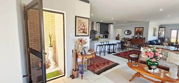 Step inside to a spacious open-plan layout where the large designer kitchenwith Quartz counter tops and a center island, gas stove, ample cupboard space, and separate sculleryflows effortlessly into the dining, lounge, and family room areas with 3 large windows and a stack doo opening onto an under cover patio with built-in braai. Enjoy effortless entertaining year-round with both indoor and outdoor built-in braais, from where one can experience views over the valley as well as distant ocean views and glimpses of roaming estate wildlife.