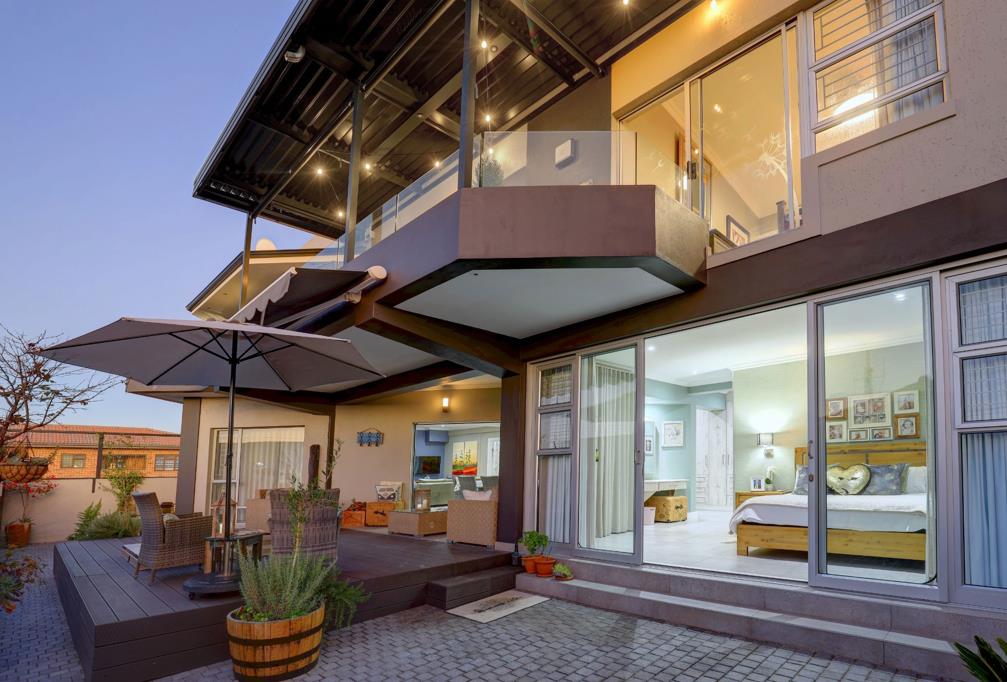 High-end finishes define this exquisite home - from the Caesar stone kitchen tops to Hans Grohe taps, Gieberits mounted toilets, American shutters, remote-controlled blinds, touch screen bathroom mirrors and other unique lighting features throughout the home. The property has a CCTV system along with access gates at the front entrance and is walled in securely. Equipped with a 7.5kw solar system with 9 Solar Panels, Inverter and 2 batteries along with 2 gas geysers for optimum energy efficiency. Generous size double garage with direct access to the home from the top level and low-maintenance paving all around. An additional covered parking bay large enough for boats, caravans or ultra-large utility vehicles. An outside bedroom with en-suite bathroom can also accommodate extra guests or serve as domestic quarters.