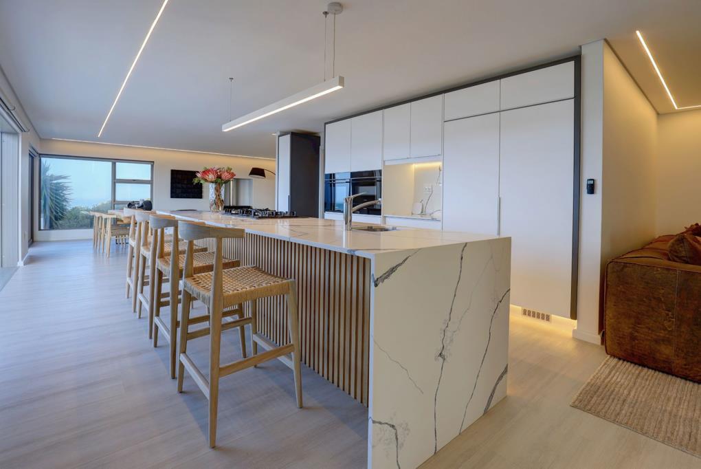 On the second floor, the entertainment area is designed for effortless hosting, featuring a built-in bar, braai, and guest toilet. It flows seamlessly onto a wooden deck and sparkling pool, creating the perfect space for both relaxation and lively gatherings.