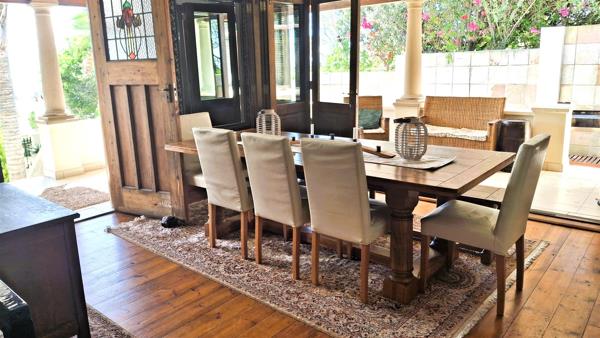 Thoughtfully and meticulously upgraded to the finest detail, the home boasts stunning wooden floors, soaring high ceilings, and a seamless flow between its elegant living spaces. The showpiece of the property is the expansive L-shaped stoep, offering breath-taking views over the lush garden, the sparkling swimming pool, and even a glimpse of the ocean. Large sliding doors connect the veranda to the interior, creating an inviting space ideal for entertaining.