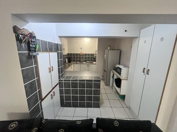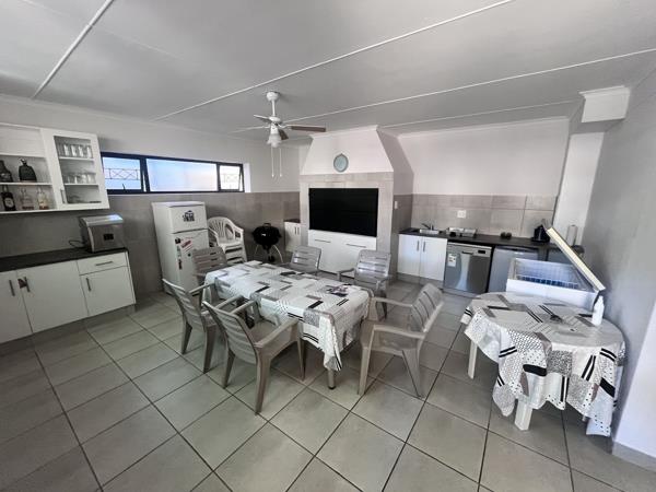 Step into an inviting entertainment room with a built-in braai, perfect for hosting guests. The open-plan layout seamlessly connects to a cozy informal lounge and a well-equipped kitchen with ample built-in cupboards.