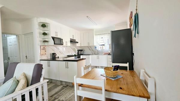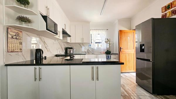 The home features three spacious bedrooms and two modern bathrooms, as well as a guest toilet conveniently located on the ground floor. The open-plan kitchen and living area create a warm and welcoming atmosphere, leading out to a covered patio with a built-in braai and a private, pet-friendly garden ideal for up to two small pets. Upstairs, a second covered patio is accessible from two of the bedrooms and offers lovely ocean views the perfect setting to relax and enjoy Mossel Bays beautiful coastal climate.