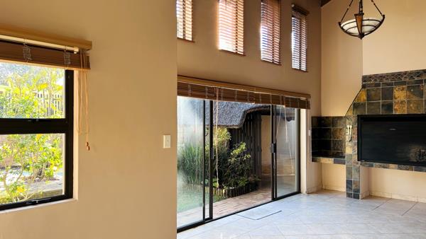 The lounge, with its cozy built-in fireplace, flows seamlessly into the dining area and braai roomcomplete with a built-in braai and large sliding doors that open onto a serene splash pool, lapa, and uninterrupted golf course views. Its a perfect setup for weekend braais, sunset drinks, and laid-back afternoons.