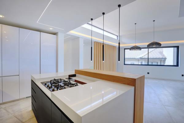 The kitchen, a masterpiece of modern functionality, features integrated appliances and a tasteful palette of grey and white accents, harmoniously juxtaposed with wood elements. The cupboards, designed for both form and function, effortlessly open with a push, enhancing the overall sleek aesthetic. The kitchen seamlessly transitions into the dining room, equipped with a fireplace and a built-in braai, perfect for entertaining. Large sliding doors open to a spacious balcony. A convenient guest toilet adds a practical touch to the main level.