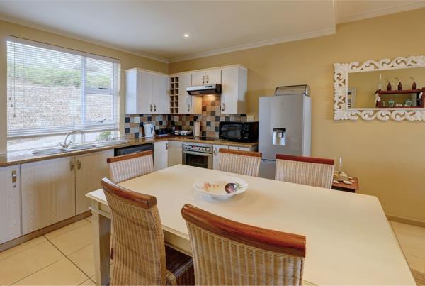 The open-plan kitchen, lounge and dining area lead to the partially covered patio with built-in braai and ample space for family meals or entertaining. There is plenty of storage space under the steps leading to the second floor.