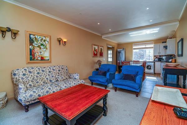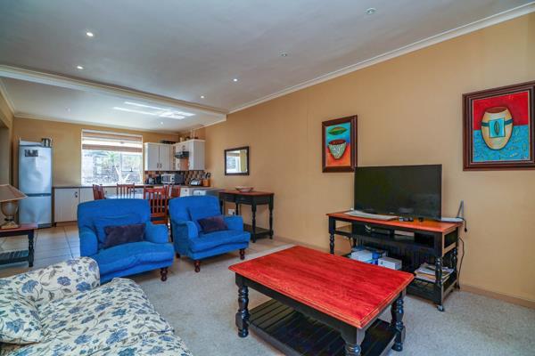 Step inside to a sleek open-plan kitchen and dining area that flows effortlessly into the inviting living room. Large sliding doors open onto a covered patio with a built-in braai, overlooking a manicured lawn that leads directly to a secure communal pool perfect for family fun or relaxed entertaining.