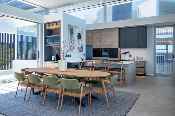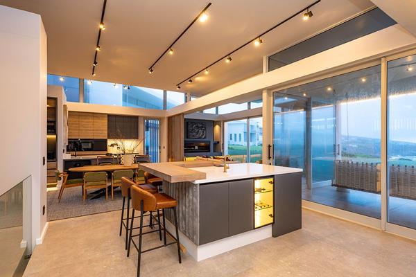 The open-plan kitchen, fitted with premium Putt appliances, features a refined mix of materials and flows into expansive living and dining areas. A dedicated coffee bar enhances convenience, while a custom wine bar forms part of the dining room, ideal for entertaining. Double-volume ceilings with elevated windows invite natural light throughout, while large sliding doors open onto generous balconies where the sound of waves enhances the coastal experience.