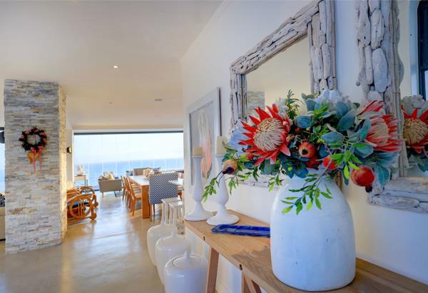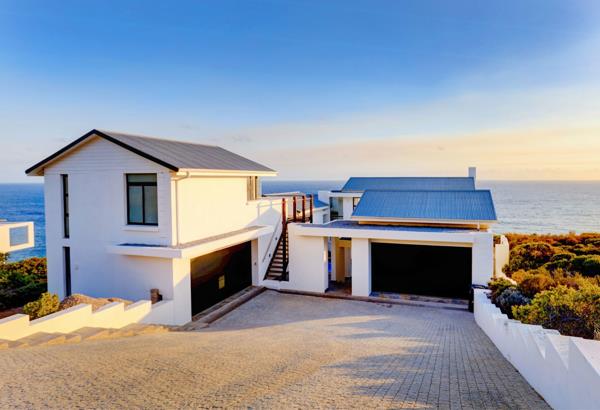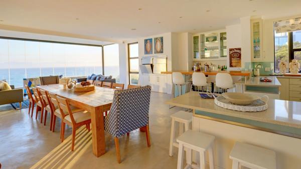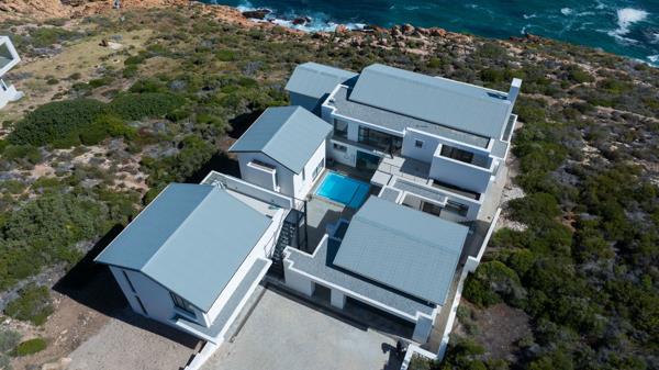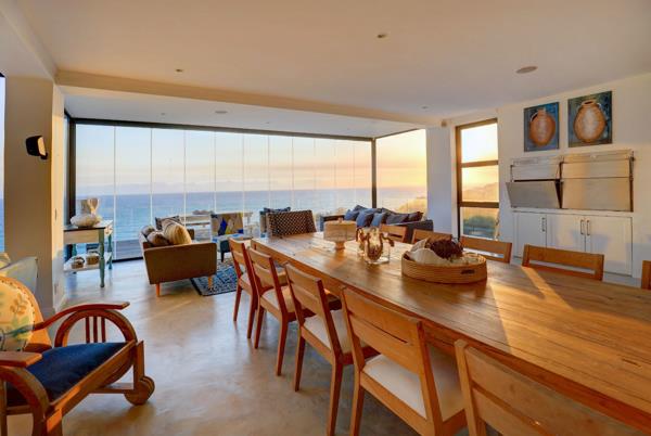 The first floor features expansive stacking windows leading to a pool area and a wooden deck overlooking the ocean and cliffs below. The open-plan layout includes the kitchen, dining, living, and an indoor braai space with a built-in bar.