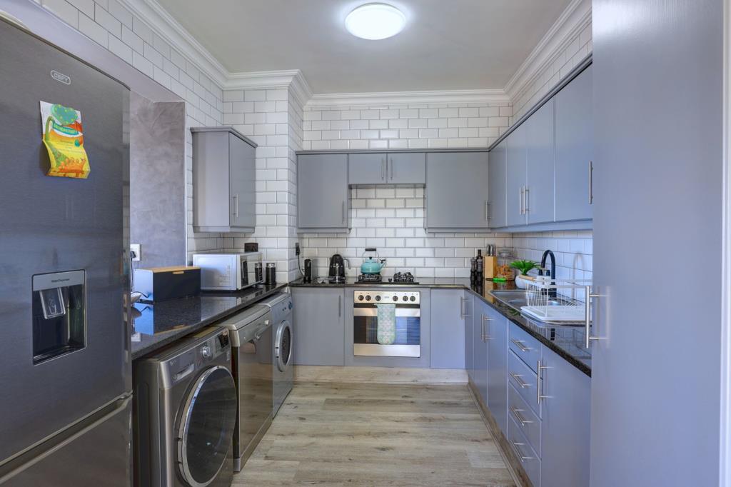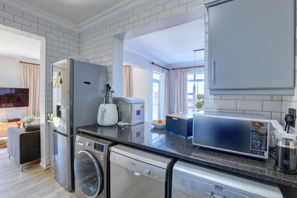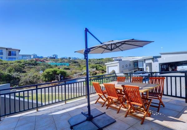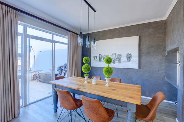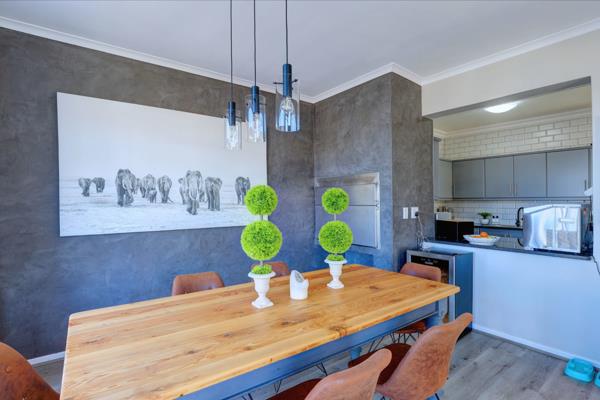 Sliding doors on both sides of the living room create a free flow onto a courtyard with an artificial lawn, as well as a large patio with beautiful ocean views. The indoor braai and dining room also open up off the living room and have sliding doors leading to a large patio, giving you endless space for entertaining. The fully equipped kitchen has everything you need.