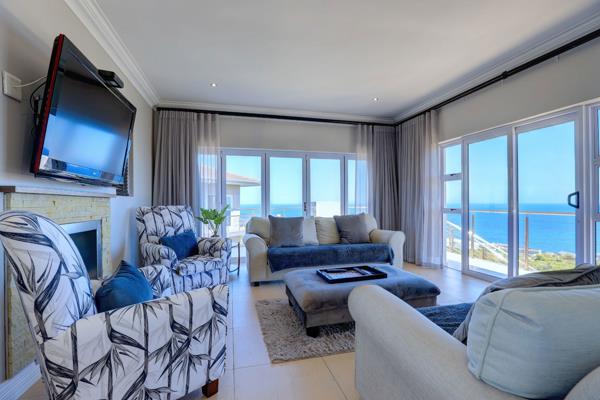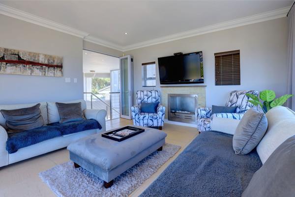 Upstairs, a separate living area with a fireplace offers a cozy retreat, while the open-plan kitchen, dining area, and indoor braai flow seamlessly into the entertainment space with a built-in bar. These all extend to a balcony through stacking doors, creating the perfect setting for gatherings.