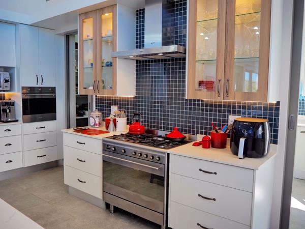 The open-plan kitchen is equipped with high-end Smeg and Samsung appliances, centered around a beautifully designed island. A walk-in pantry and scullery provide added convenience, enhancing the kitchens seamless flow.