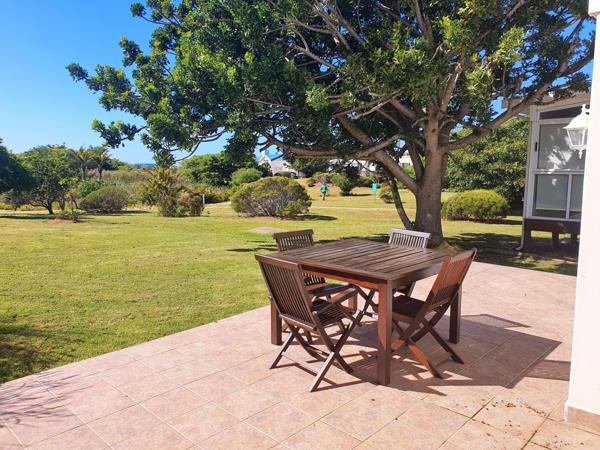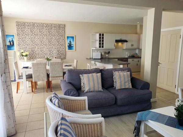 The open-plan kitchen, dining, and living area create an inviting space that flows onto a tiled patio with a built-in braai, perfect for entertaining.
