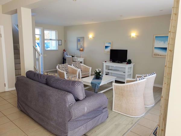Upstairs, both bedrooms provide privacy, each with its own bathroom, while large windows capture breathtaking coastal views.
