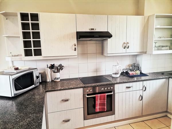 This Lodge is on two levels. The lower level consists of a very spacious open plan kitchen, lounge and dining area that opens up onto a patio with a built-in braai and big sliding doors and windows, which floods this living area with sun and light.