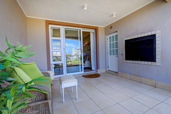 The open-plan living and kitchen area seamlessly connects to an undercover patio with a built-in braai, offering serene views of the communal pool and ocean. The ground level features a well-appointed en-suite bedroom and a spacious storage cupboard for convenience.