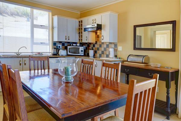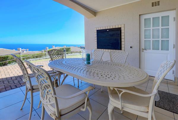 The open-plan kitchen and living area flow seamlessly to an undercover patio with a built-in braai, overlooking the communal pool and the beauty of Pinnacle Point below.