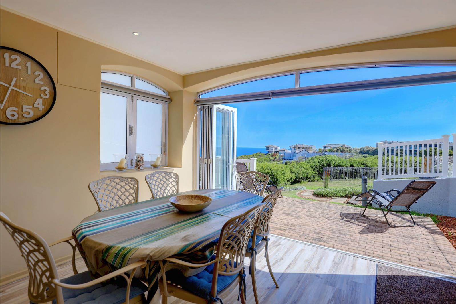 The open-plan kitchen and living area extend to an indoor braai space, where stacking doors frame panoramic views of the estate and ocean. The first level includes a well-appointed en-suite bedroom with sliding doors opening to the surroundings.