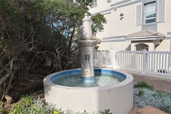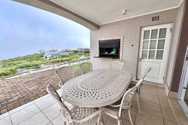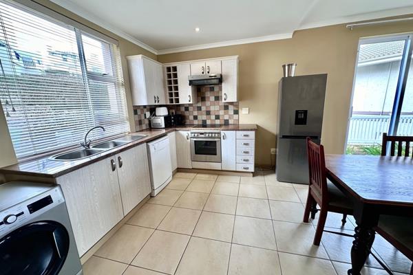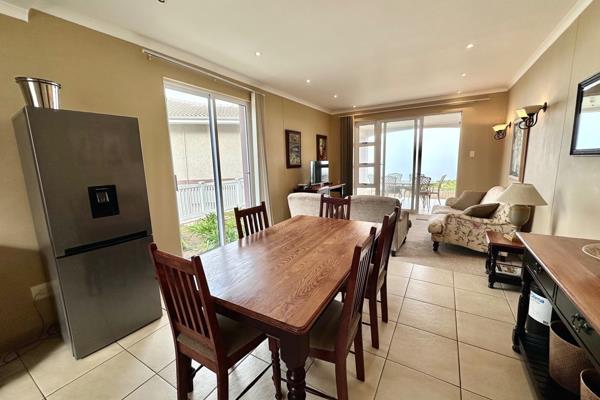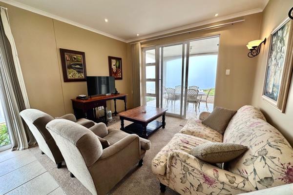 Featuring three spacious bedrooms and three en-suite bathrooms, the open-plan design seamlessly connects the modern kitchen to the dining and living areas, both of which lead out to a lush lawn and a patio equipped with a built-in braai and stunning sea views. Very close to communal swimming pool.