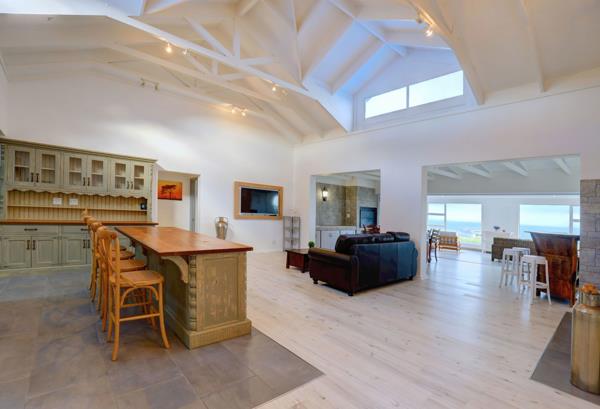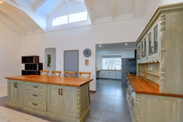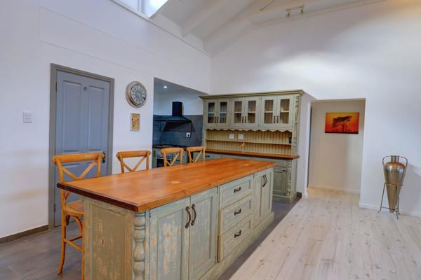 Step into a kitchen that opens into a large living area, featuring an indoor braai area with double volume and exposed beams and two fireplaces. This design floods the space with natural sunlight, creating a warm and inviting atmosphere.