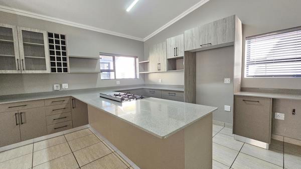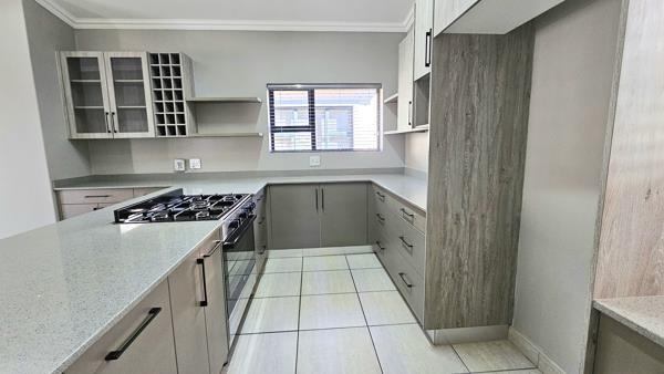 Open plan kitchen with trendy greyish easy quartz tops, ample cupboard space, walk in pantry and a separate scullery.