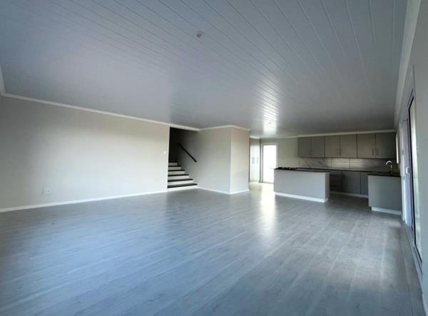 The open-plan living area leads to a sleek kitchen with soft grey finishes, a gas stove, electric oven, ample cupboard space, a double sink, and room for multiple appliances.