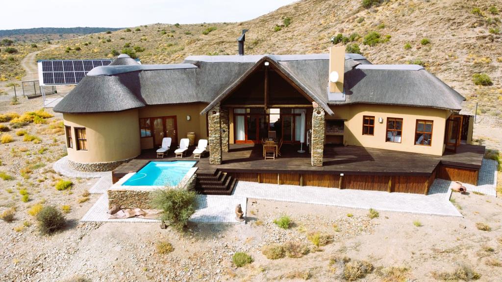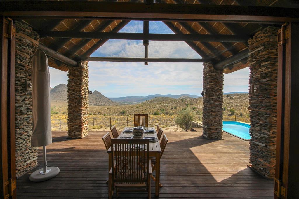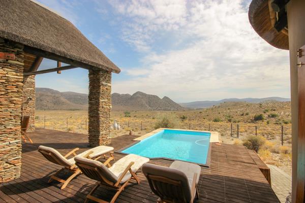 Exquisite Game Lodge Retreat in the Klein Karoo. Nestled within a sprawling 3100-hectare eco estate, this exceptional property occupies 70.8 hectares, offering ultimate seclusion and breathtaking panoramic views of the mountains and iconic Karoo landscape.