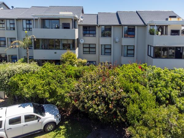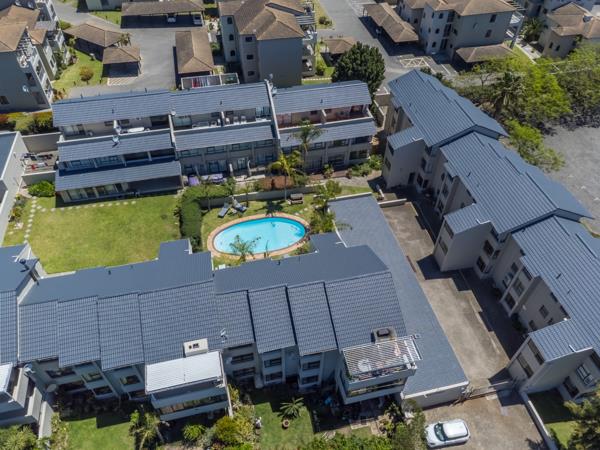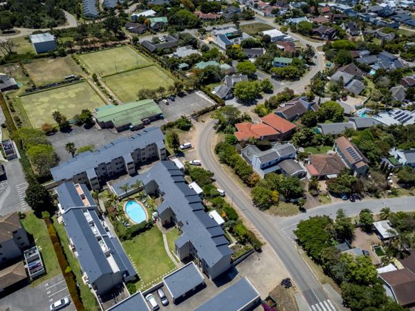 The complex has a sparkly pool and additional lawned areas within the enclosed development.