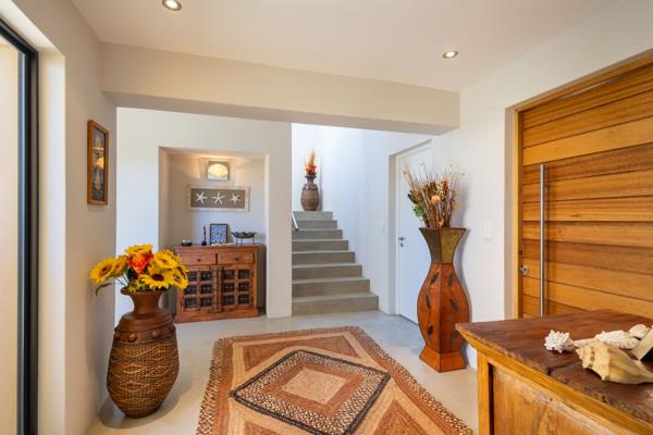 One is welcomed onto the ground floor with a bright entrance hall, with large picture windows framing the garden. A well-appointed guest bedroom on this level is carpeted, with white-washed exposed trusses, built-in cupboards, and an en-suite bathroom with large walk-in shower. The open plan living, dining, and kitchen areas present themselves with effortless flow, all with stylish concrete flooring. The kitchen includes a central island with granite tops, a gas hob and electric oven, and a separate laundry with space for three appliances. Stacking doors open from the living room onto a covered patio with built-in-braai, lap pool and a private garden. This outdoor area is the ideal spot for relaxing or entertaining. There is a double automated garage with direct access to the home.