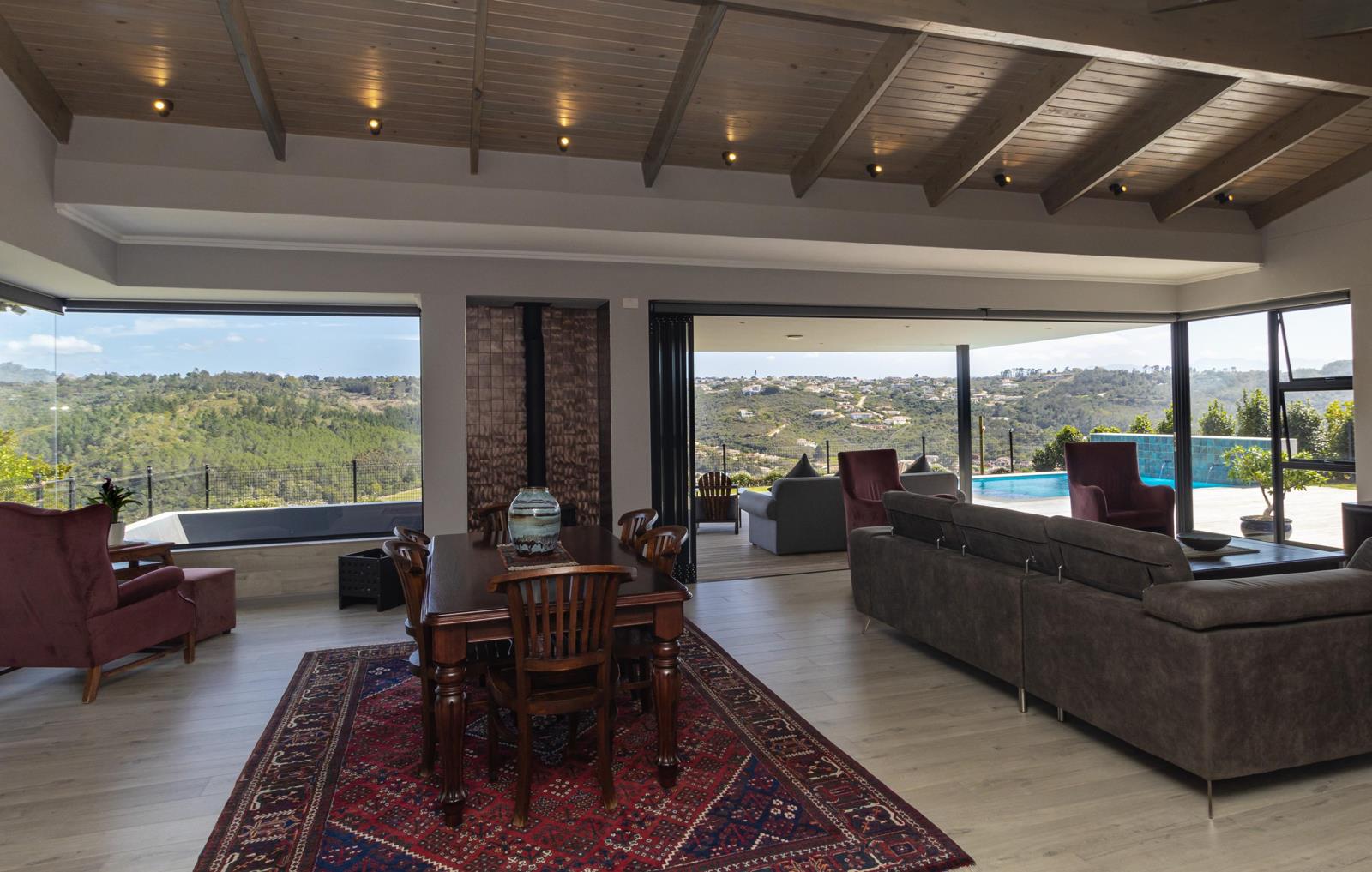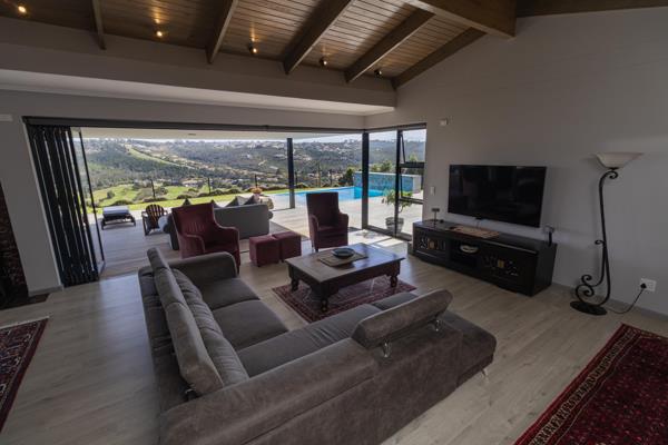 Through the 24-hour manned security gate, you enter Brackenridgea nature estate of honourable distinction, awarded Readers Choice Best Estate 2025 in Plett and Knysna. The road winds upward, elevating you above town, past elegant homes with manicured gardens where proteas bloom in technicolour, until you arrive at this spectacular contemporary home. You park in the double garage before stepping through the grand glass front door into the foyer, where a window across the way foreshadows the views to come.