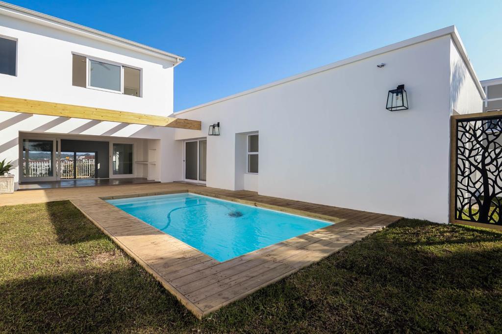 Upstairs is an en-suite bedroom, a study, guest toilet and a spacious lounge. Enjoy lovely views of Robberg, the evergreen valley and the mountain range through wrap-around windows.
