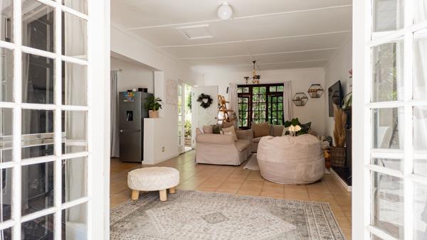 As you approach the main house, you notice subtle Cape Dutch influences in its whitewashed walls, scalloped roof, and handcrafted wood detailing that bring warmth and texture throughout. Two separate units one with three bedrooms and one with a single bedroom share the structure, while the patio, framed by lush monsteras, invites you to sit back and soak in the majesty of the gardens beyond.