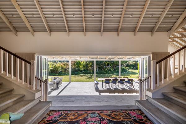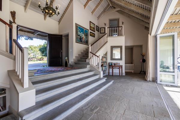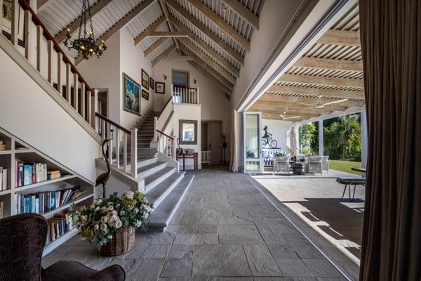 The double volume entrance with a dual staircase, leads onto the sun-drenched patio, framed by stacking doors. Riven stone tiles create a French Provencal ambience and nature is only a few steps away from the open plan living, dining and kitchen area with lovely views from every window.