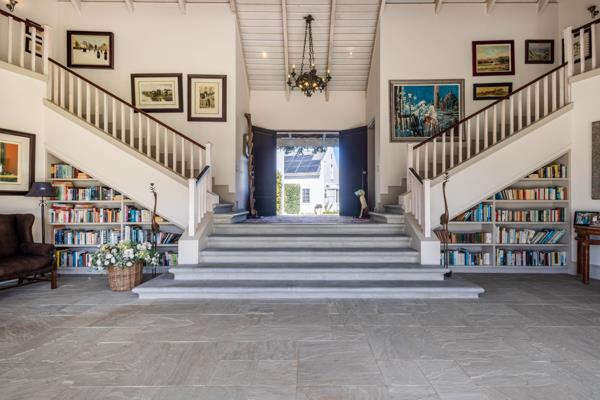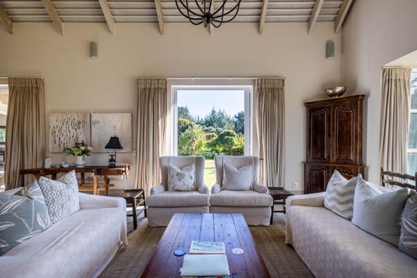 Set on a 3287m stand, this well-maintained property in the Eastern Cape Dutch style, offers sweeping views flowing from entrance hall to lush gardens bordering a dam, home to fish eagles, kingfishers and resident nesting herons.