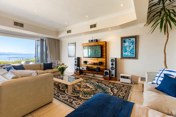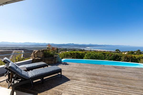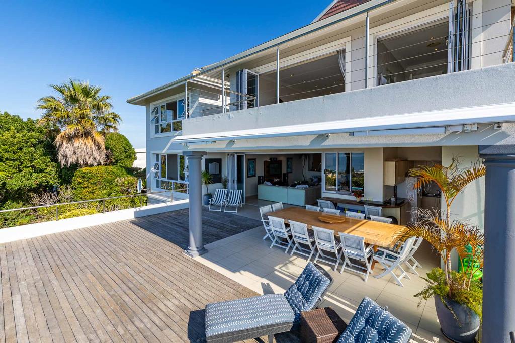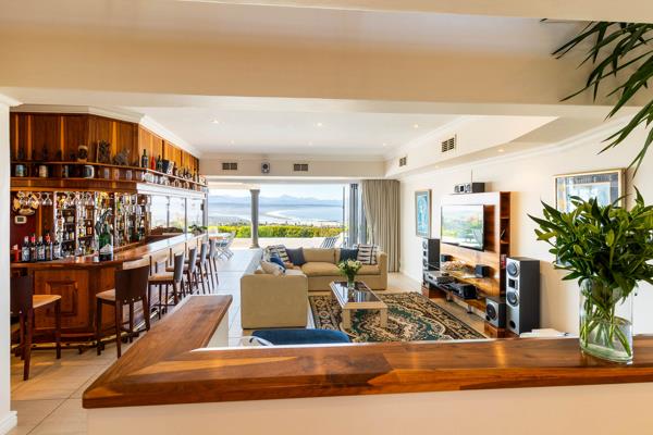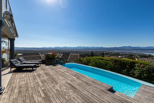 Ground Floor: Step into an immaculate triple-story north-east facing home, offering uninterrupted vistas of the Indian Ocean, Lookout Beach, Keurbooms Lagoon, and the distant mountain ranges. The spacious entrance hall sets the stage, unveiling panoramic views that stretch as far as the eye can see. Entertain in style in the large entertainment lounge, complete with a bar and TV, where glass doors seamlessly connect to the expansive covered wood-floored patio. Here, youll find a heated infinity pool, along with a built-in braai area and kitchenette for easy outdoor entertaining. A guest toilet, study/office, open-plan dining room, and formal lounge while the modern kitchen, with granite surfaces, leads to a breakfast patio in a private garden. Additional features include a large walk-in pantry, scullery, water purification system and laundry facilities for added convenience.