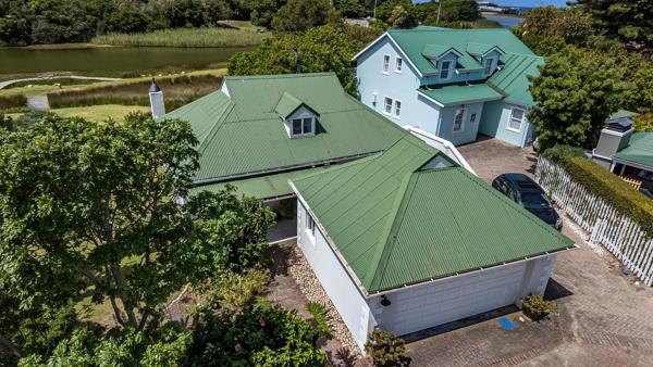 Set along the coveted riverside strip enjoyed by only a handful of homes, this charming cottage-style residence revels in its rare front-row position. Overlooking the serene landscape is a northeast-facing porch with a built-in braai, pull-out awning, and space for dining or lounging, where you can savour the idyllic view. Inside, the air-conditioned open-plan living space features a cozy lounge with a wood-burning fireplace, and a dining area both set beneath elegant crystal chandeliers. The kitchen is fitted with a curved counter peninsula with casual seating, black granite countertops, white cabinetry, an induction hob and oven, full appliance provisioning including laundry, and a door that leads to the drying yard. All three bedrooms feature built-in storage and ceiling fans, with the master enjoying peaceful river views and an ensuite bathroom, and the two additional bedrooms sharing a detached bathroom between them. Stairs by the entry rise to a bright mezzanine with lookout windows and a gently pitched ceiling, creating a versatile space that works wonderfully as an office, creative studio, or perhaps a childrens lounge. A two-car detached garage completes this charming home an uncommon and attractive feature in the estate.