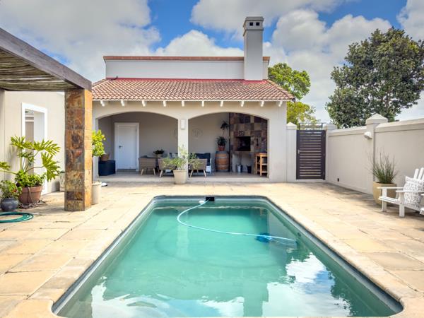 Outdoor living is a highlight, with a private courtyard with swimming pool and lapa with a built-in braai perfect for al fresco dining and relaxation. The property also includes a gas fireplace, a beautifully maintained garden with an automated irrigation system. Parking is generous, with a double garage and four additional parking bays, plus an extra toilet and basin located in the garage.