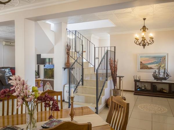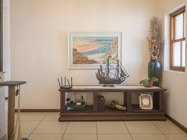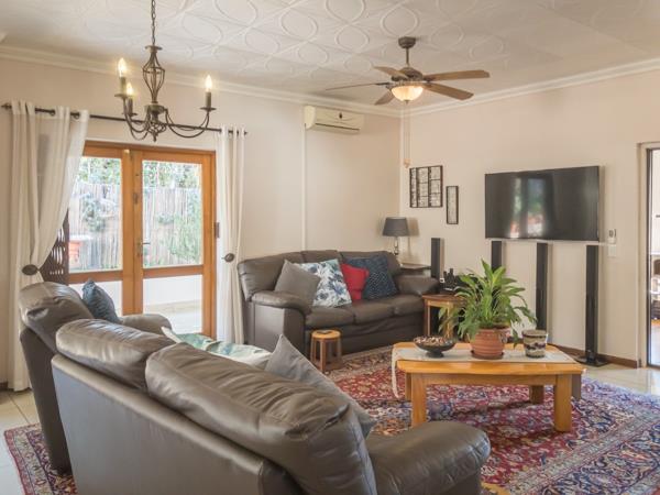 The living area gracefully extends to a sheltered entertainment space, accessed through double doors, creating a seamless indoor-outdoor living area. This alfresco haven incorporates a built-in braai and a sparkling swimming pool with deck that is ideal for hosting gatherings.