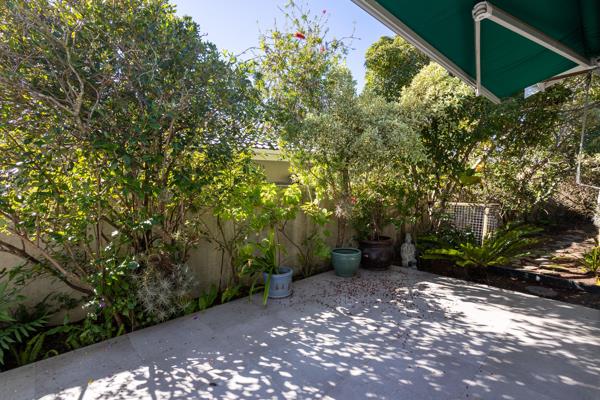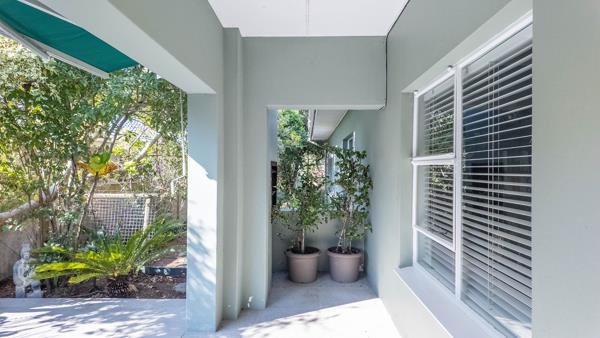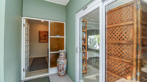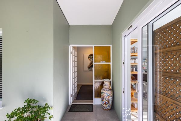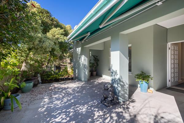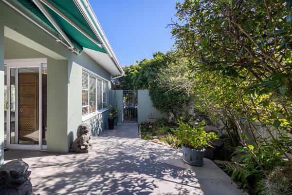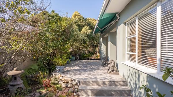 The homes green and white facade peeks through flowering trees that line the edge of this north-facing property, where a sliding gate opens to welcome you into a fully fenced sanctuary. Past the ample off-street parking, you ease into the single-car garage and follow a winding path that leads through an artfully arranged rock garden to the side entrance, where a magnetic-locked gate swings open to a charming front porch. Green pillars frame the space, while a built-in braai and roll-out awning offer a shady spot to enjoy the wonderful weather of Plettenberg Bay.