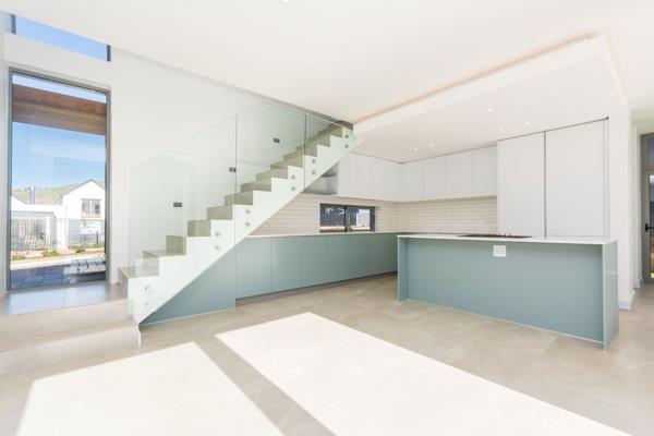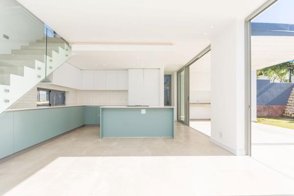 The ground floor features open plan living, dining and kitchen, with engineered stonework tops, stylish cabinetry, Smeg integrated fridge, gas hob and oven, and a separate scullery with the option of Smeg appliances. The living area opens seamlessly onto a covered patio with a built-in braai, that leads onto a large private garden with ample space for a pool. The living room has a wood burning fireplace for those chilly winter nights.