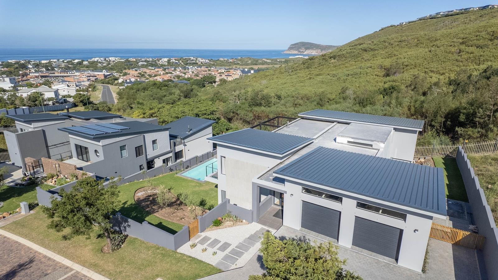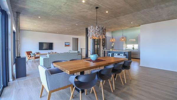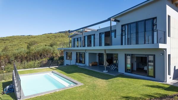The expansive balcony with a built-in barbeque provides the perfect space to relax or entertain while enjoying panoramic views of the Bay, stretching from the Robberg Nature Reserve to Natures Valley, framed by the majestic Tsitsikamma Mountains. With a guest toilet, indoor fireplace, and flexible layout, the top floor is designed to cater to both large families and those with mobility challenges.