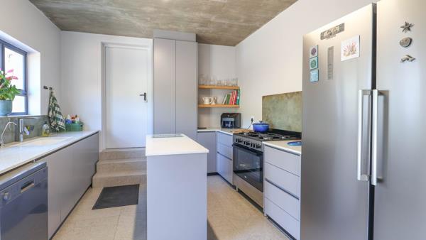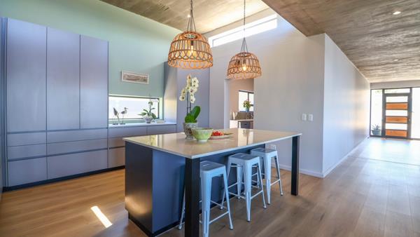 The top floor of this home features an open-concept lounge and dining room (with a built-in wood-burning heater) and a spacious kitchen with a separate scullery that gives direct access from the garage to the home.