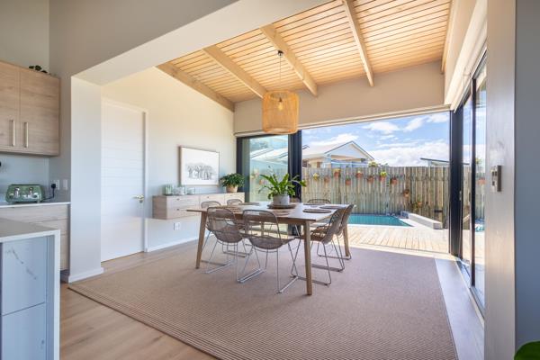 The glass-wrapped dining area invites you inside, held by two windowed walls that keep the view front and centre. From there, the space flows into an open-plan kitchen, where clean quartz countertops, oak-styled finishes, and glass bubble lights create a natural modern aesthetic. Above, timber mono-pitched ceilings rise gently overhead, lending the space an airy, effortless charm. Blending form with function, the kitchen includes a gas hob and electric oven, complemented by a gas geyser to reduce reliance on electricity. The generous island anchors the room, made for casual breakfasts or evenings shared over wine, and transitions smoothly into the spacious lounge, designed to pull you forward. A full wall of glass leads to a deck that floats out into the viewperfect for watching the Robberg cliffs at sunset, glowing auburn before the stars appear. Throughout the home, every window is double-glazed to maximize energy efficiency, keeping interiors cooler in summer and warmer in winter, and is fitted with soft bamboo blinds that can be drawn down as evening settles in.