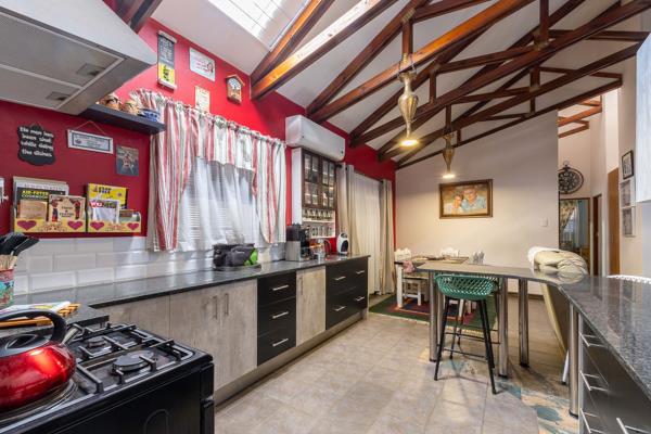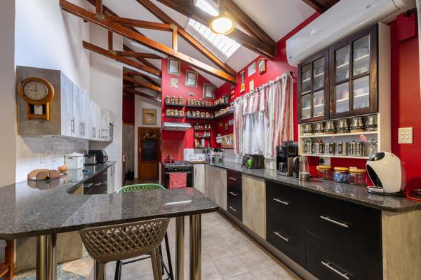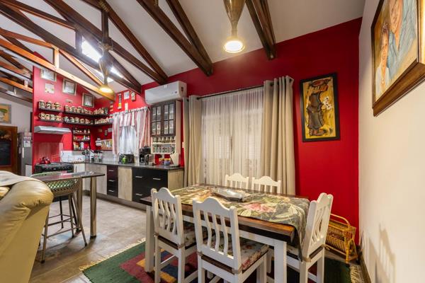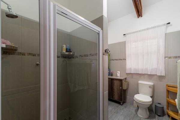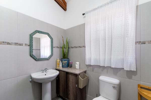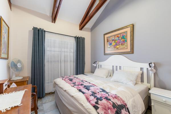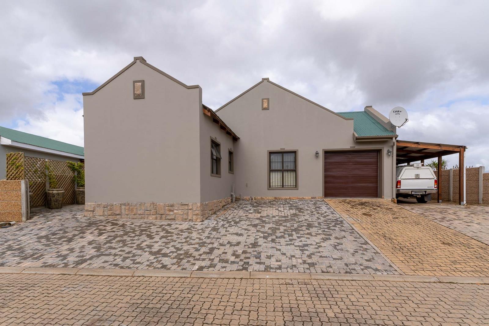 Practically designed three-bedroom house in a secure complex in Riversdale, Western Cape. Fun features include a splash pool and a deck in the garden area, as well as an under-roof fireplace with canvas sides that can open or close depending on the weather. The open-plan living room and kitchen have granite tops, and the exposed trusses create space. The house has a 10 kVA battery system and 8 kVA inverter that make it loadshedding-resistant.
