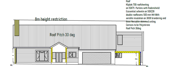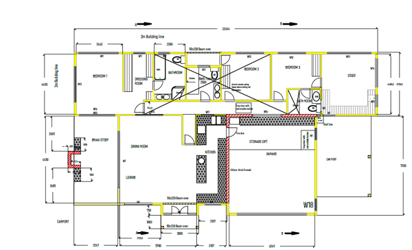 Architectural drawings highlight a modern design with a 30-degree pitched roof, specified with durable Kliplok 700 sheeting, Radenshield and Aerolite insulation for energy efficiency. The plans include an integrated garage with a storage loft, a separate carport and an inviting outdoor ''Braai Stoep'' perfect for entertaining. Provisions for solar panels are also incorporated, aligning with sustainable living practices and adhering to an 8m height restriction.