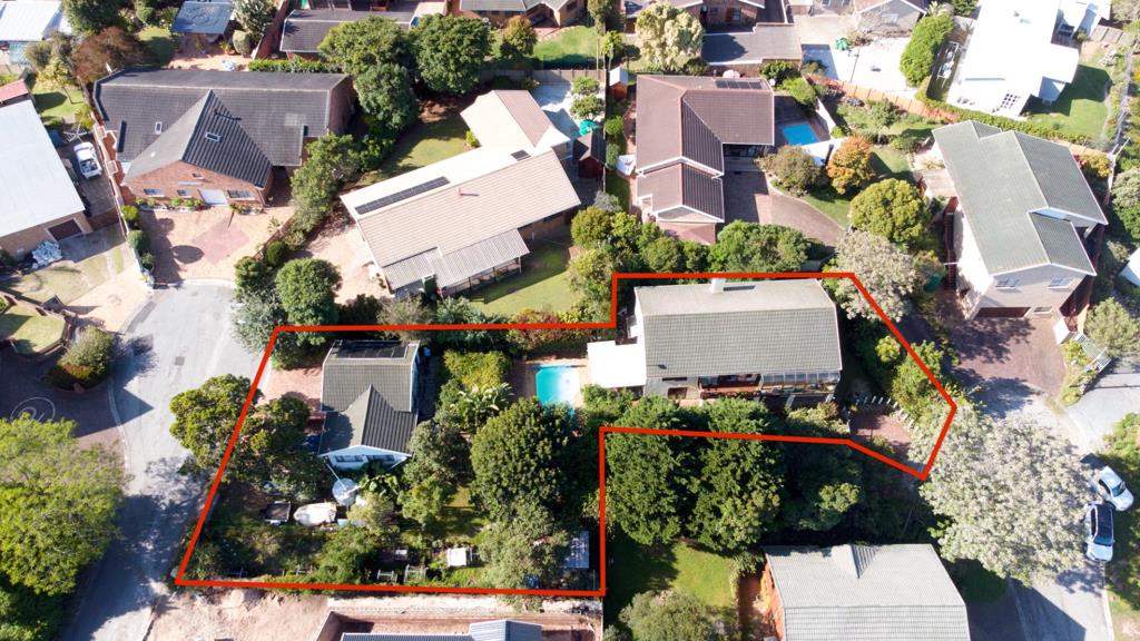 Upstairs :Up the flight of stairs to a generous-sized lounge area with a fireplace and doors leading to a private balcony. The master bedroom is a true retreat boasting a walk-in dressing room and a full en-suite bathroom. Doors lead to a large sunroom boasting floor-to-ceiling glass which is the perfect artists studio or work space. The balcony extends out the atrium looking over the lush front garden. Two double-sized bedrooms share the full family bathroom. The second property 715 sqm that is linked comprises of a 72 sqm double garage and workshop. Creatively this can be converted into a comfortable garden cottage. To the side of the garage and workshop is a driveway for boat or trailer access parking. The generously sized property provides endless possibilities for expansion. A separate driveway entrance from the cul-de-sac makes this separate and private from the main dwelling.