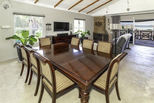 LIVINGDINING ROOM: Open plan area with a lounge, dining room, fireplace, and cement screed floors. The lounge has sliding doors leading to a viewing balcony.